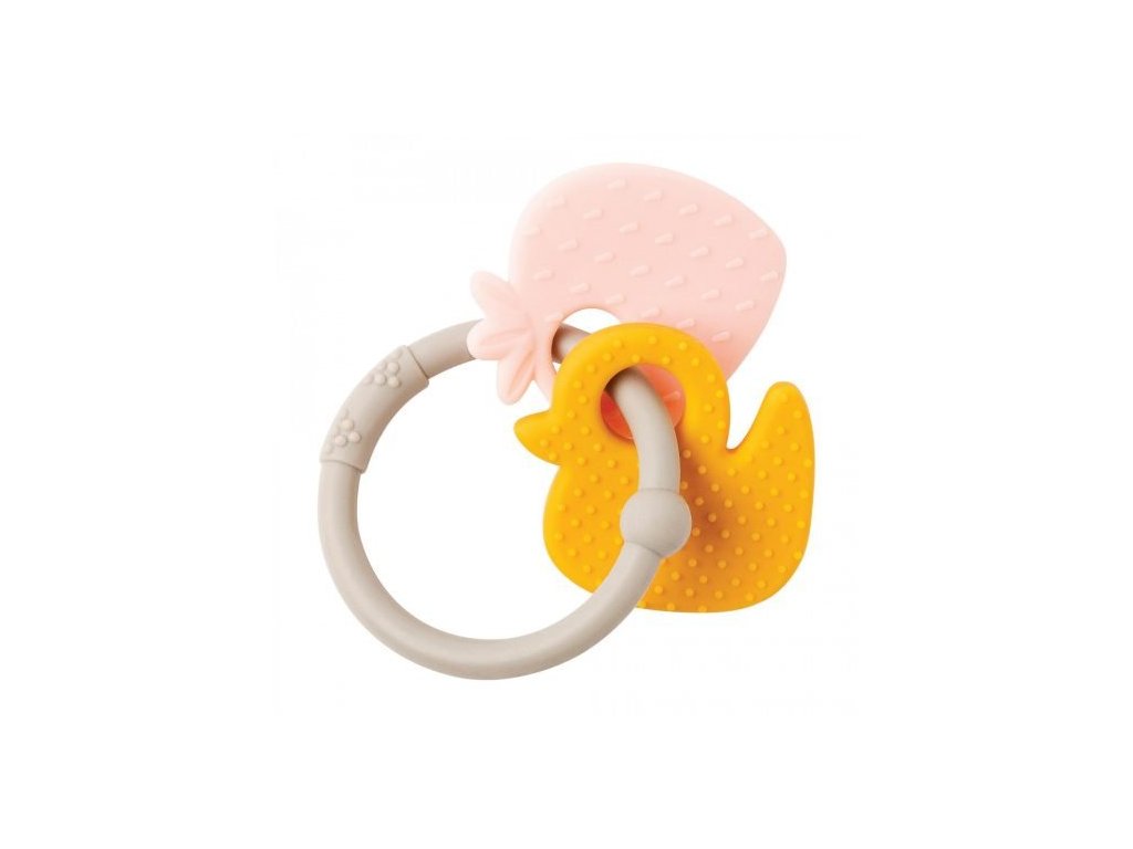 Silikonové kousátko, složené ze tří různých částí, zmírní bolest při prořezávání prvních zoubků. Může být použito i jako jednoduché chrastítko a také díky svému tvaru a designu na rozvoj motorických dovedností malých ručiček.