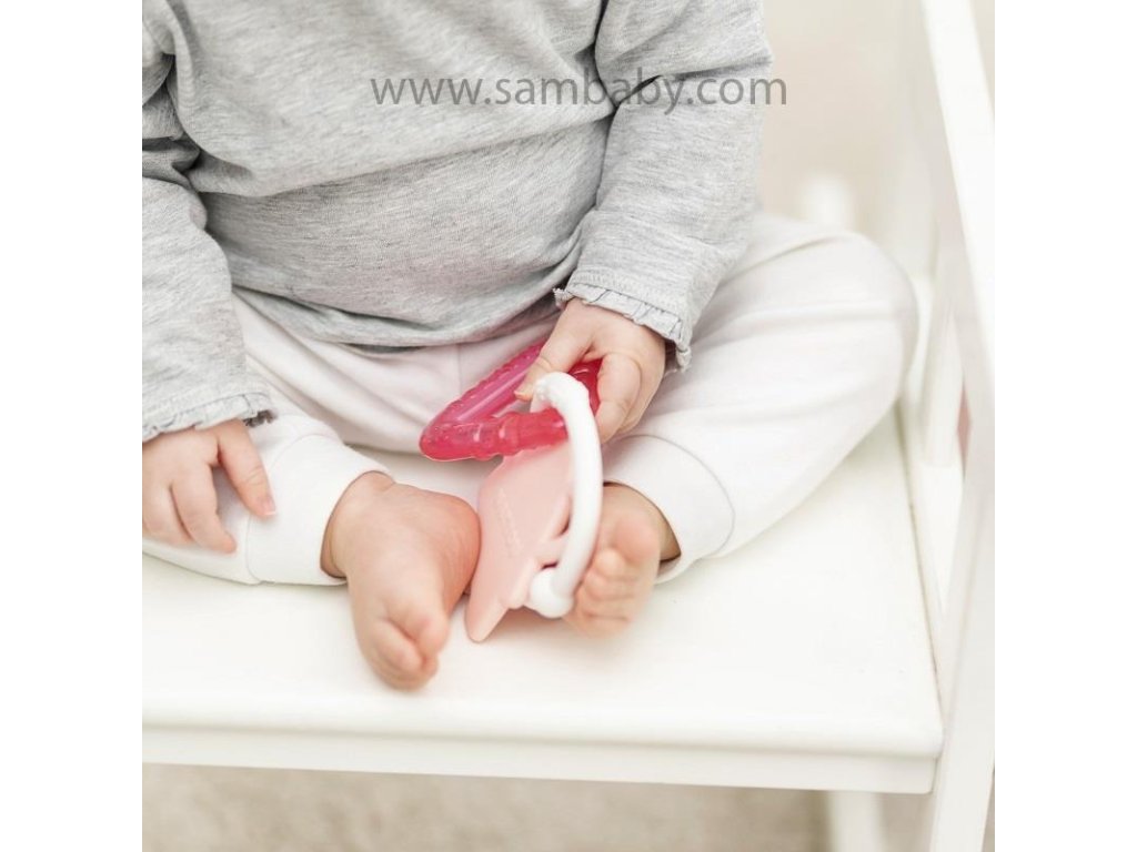 Silikonové kousátko, složené ze tří různých částí, zmírní bolest při prořezávání prvních zoubků. Může být použito i jako jednoduché chrastítko a také díky svému tvaru a designu na rozvoj motorických dovedností malých ručiček.