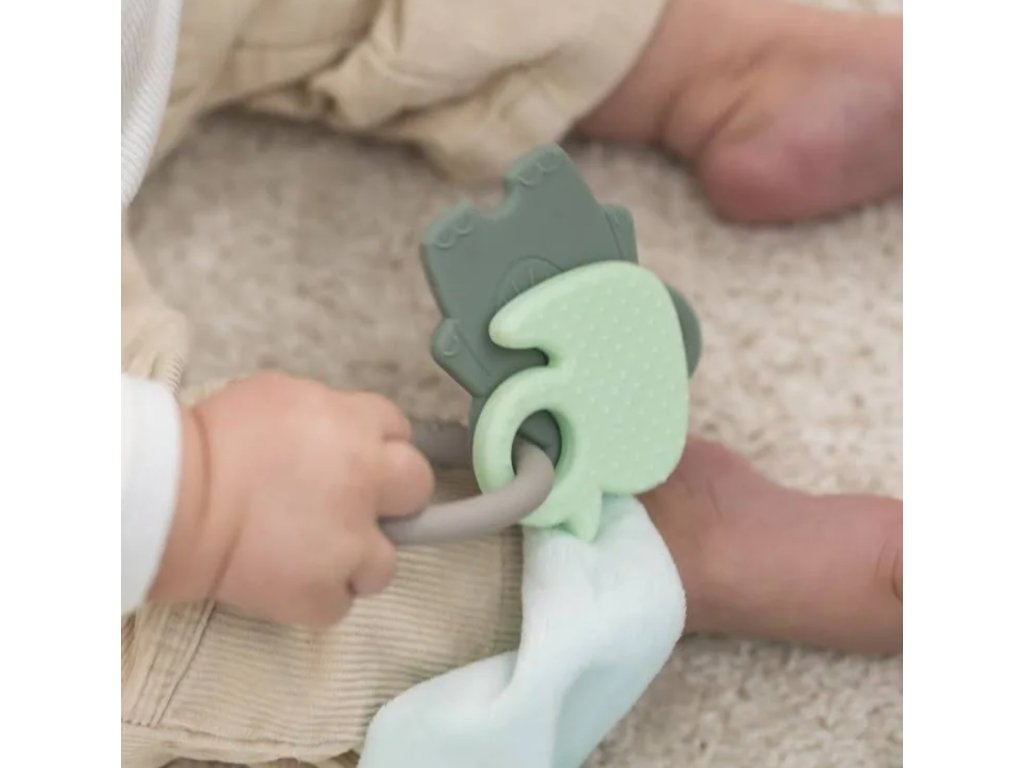Silikonové kousátko, složené ze tří různých částí, zmírní bolest při prořezávání prvních zoubků. Díky svému tvaru a designu na rozvoj motorických dovedností malých ručiček.