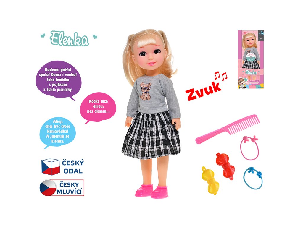 Veselá panenka Elenka blondýnka v letním oblečku, česky mluvící, součástí je hřeben a vlasové doplňky. Hračka na baterie, se zvukem. Panenka má na bříšku tlačítko, kterým se spouští její mluvení. Fráze se střídají po každém stlačení. Panenka je celoplastová a má pohyblivé ruce v ramenou a nohy v kyčlích.