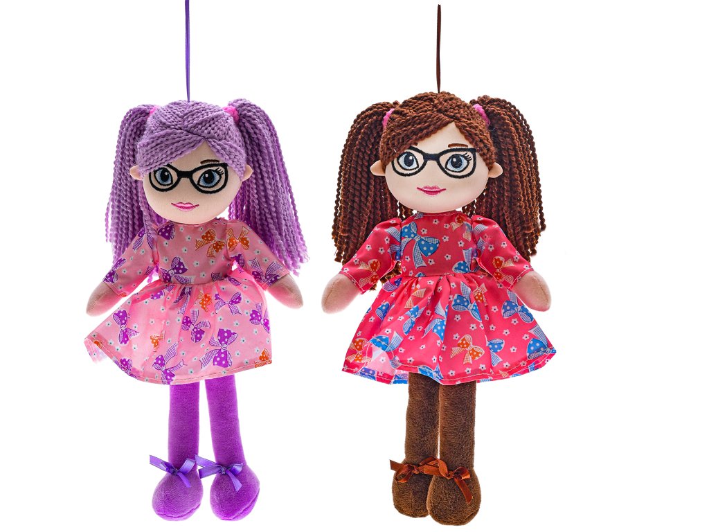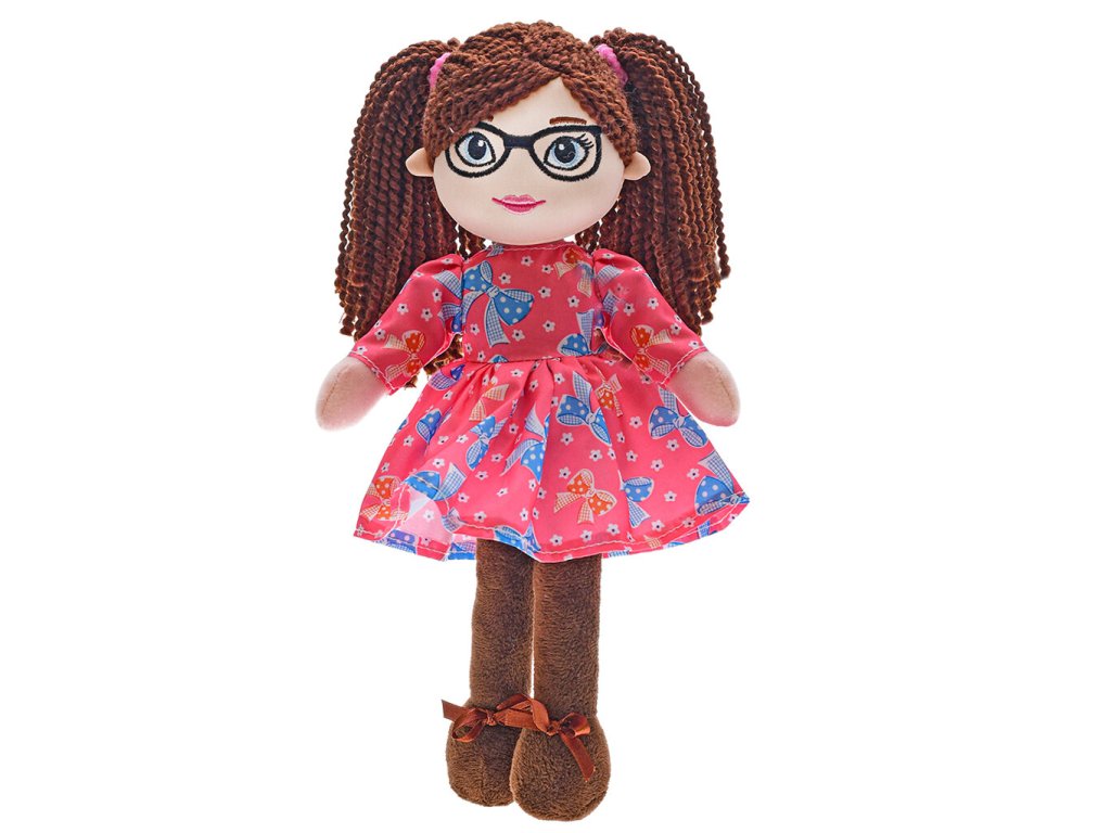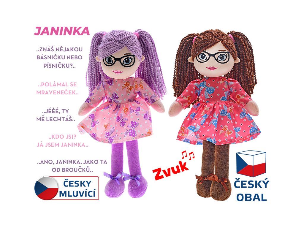 Janinka - měkká textilní usměvavá panenka s copánky, s brýlemi, v krátkých šatičkách, česky mluvící, vhodná i pro nejmenší děti.