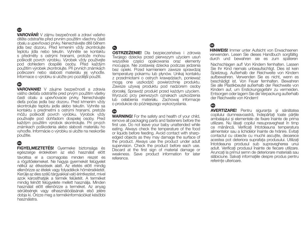 V zájmu bezpečnosti a zdraví vašeho dítěte odstraňte před prvním použitím všechny části obalu a upevňovací prvky. Nenechávejte dítě během jídla bez dozoru. Před krmením vždy zkontrolujte teplotu jídla nebo tekutin. Vyhněte se kontaktu s předměty a ostrými hranami, protože mohou poškodit povrch výrobku. Výrobek vždy používejte pod dohledem dospělé osoby. Před každým použitím výrobek zkontrolujte. Při prvních známkách poškození nebo slabosti materiálu jej vyhoďte. Informace o výrobku si uložte pro pozdější použití.