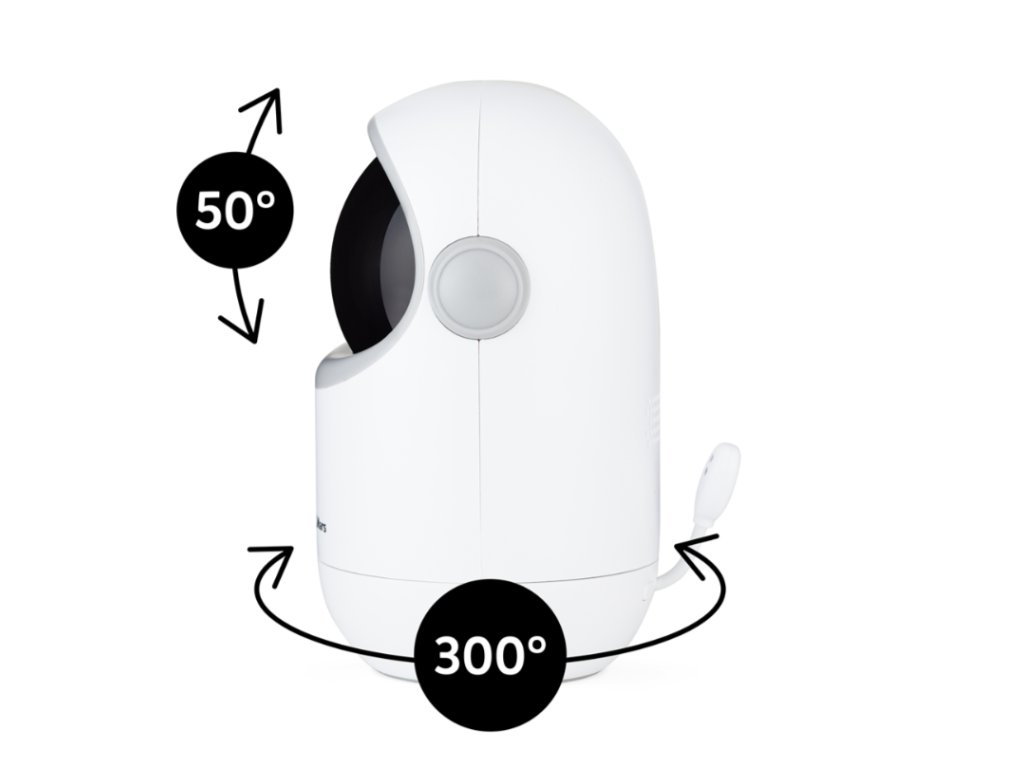 Kamera má široký rozsah pohybu: horizontálně až 300° (150° vlevo i vpravo), vertikálně 30° nahoru a 20° dolů. S úhlem záběru 68° tak máte dokonalý přehled o prostoru kolem postýlky či herní zóny.