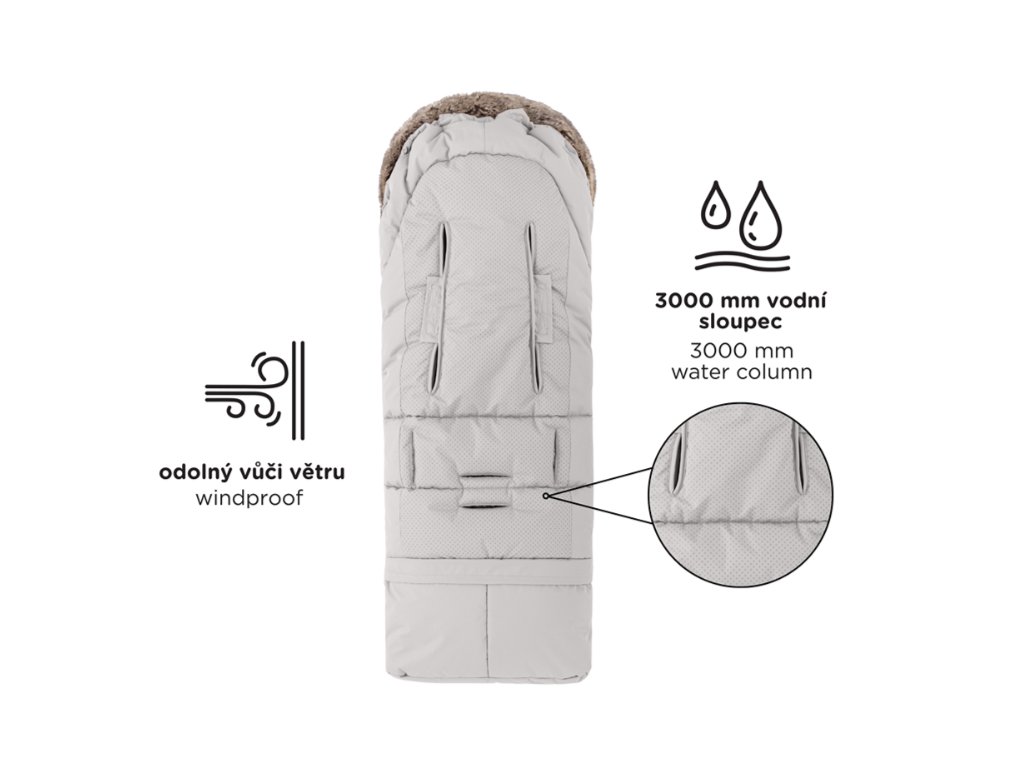 - 4v1 – odepnutím spodní části změníte velikost fusaku na menší, který se hodí i do vaničky nebo autosedačky, a připevněním kožešinky – získáte ochranu proti větru.