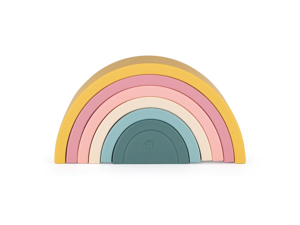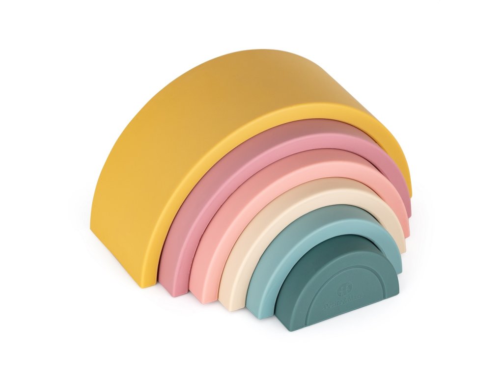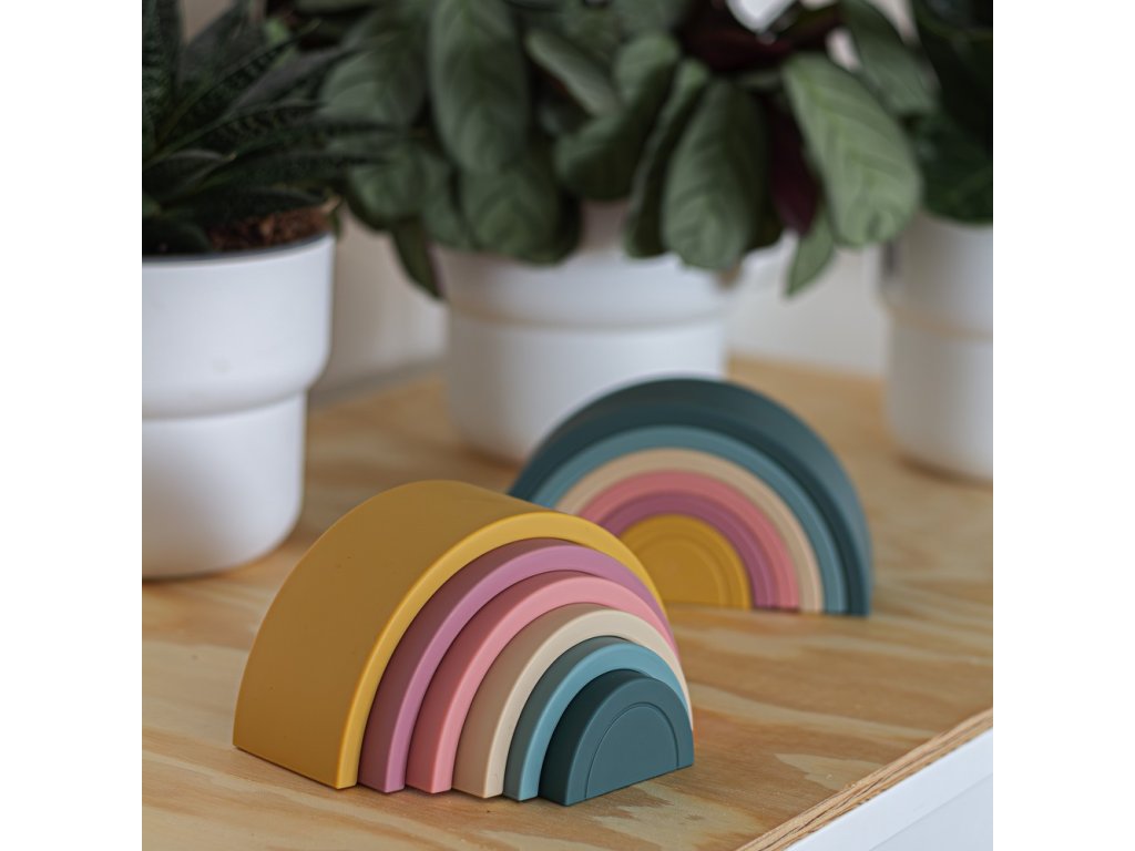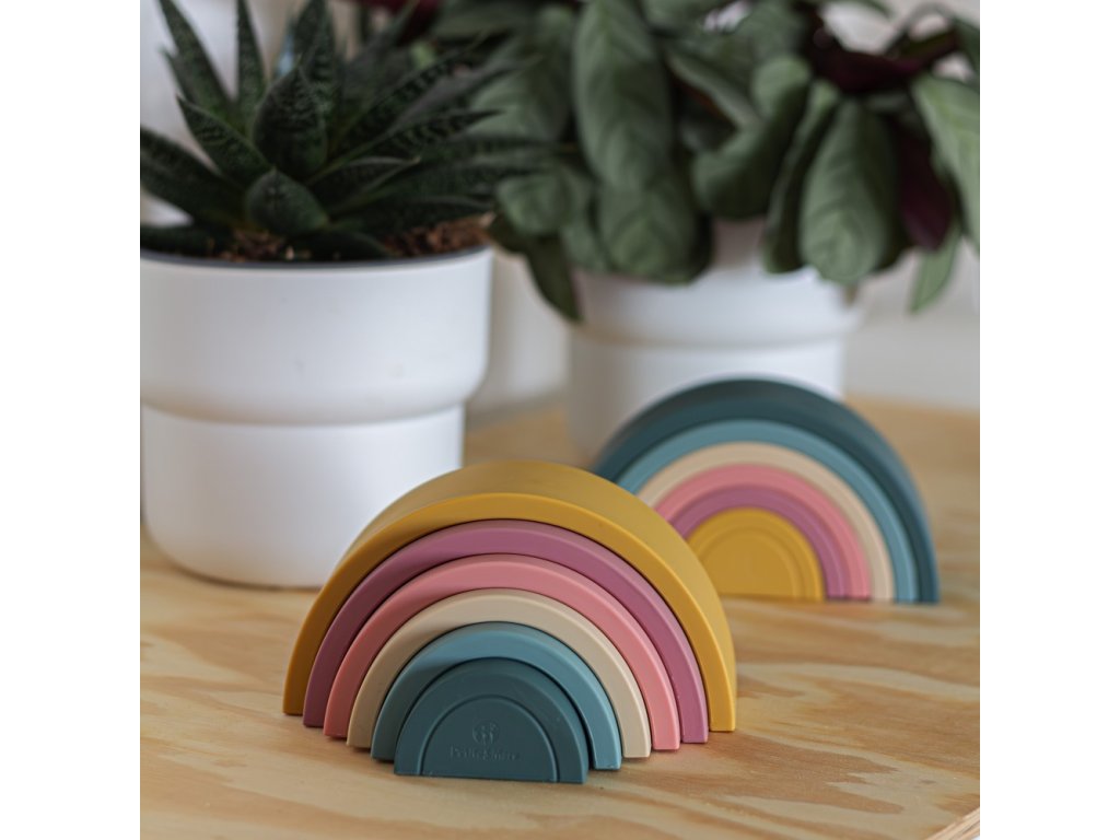 Silikonová skládací hračka RAINBOW se skládá ze šesti barevných oblouků, které po položení na sebe tvoří krásnou duhu. Duha je magickou bránou do světa tvarů, barev a učení. Skládání oblouků, jejich otáčení nebo pokládání jednoho oblouku na druhý je výborný cvik pro malé ručičky. Dítě si procvičuje přesnost pohybů a koordinaci. Puzzle vzbuzuje zájem dítěte, zaměřuje jeho pozornost příjemnou a poutavou formou a učí ho kreativnímu myšlení. Uspořádání neklade konkrétní pravidla, čímž podporuje kreativitu. Dítě se přitom skvěle baví, může vytvářet vlastní verze skládačky, rozvíjet stavitelské dovednosti a procvičovat prostorovou představivost.