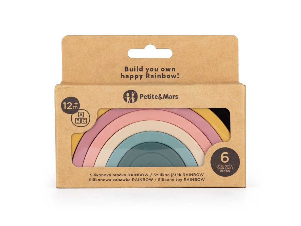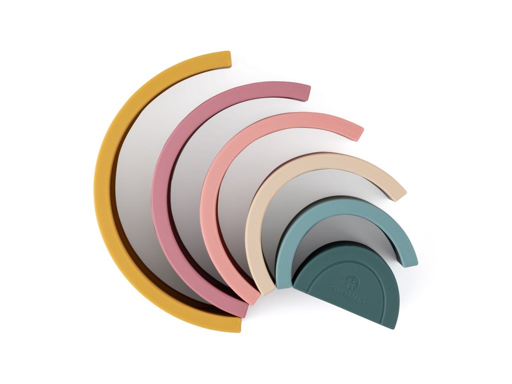 Silikonová skládací hračka RAINBOW se skládá ze šesti barevných oblouků, které po položení na sebe tvoří krásnou duhu. Duha je magickou bránou do světa tvarů, barev a učení. Skládání oblouků, jejich otáčení nebo pokládání jednoho oblouku na druhý je výborný cvik pro malé ručičky. Dítě si procvičuje přesnost pohybů a koordinaci.