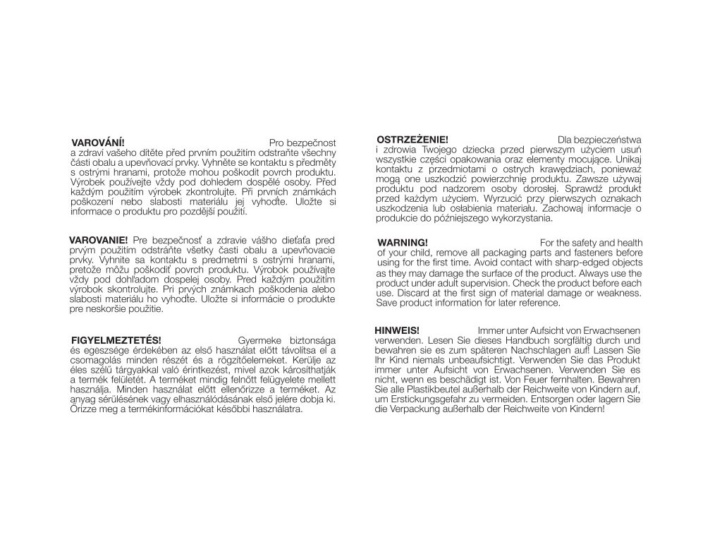 Pro bezpečnost a zdraví vašeho dítěte před prvním použitím odstraňte všechny části obalu a upevňovací prvky. Vyhněte se kontaktu s předměty s ostrými hranami, protože mohou poškodit povrch produktu. Výrobek používejte vždy pod dohledem dospělé osoby. Před každým použitím výrobek zkontrolujte. Při prvních známkách poškození nebo slabosti materiálu produkt zlikvidujte. Uložte si informace o produktu pro pozdější použití.