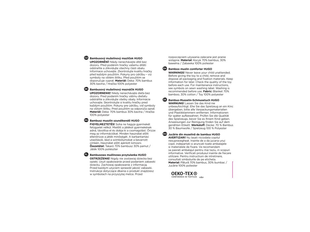 Materiál, ze kterého je Hugo ušitý je velmi kvalitní a splňuje Oeko-tex® Standard 100. To znamená, že každá jedna složka materiálu je pro děťátko bezpečná a neobsahuje žádné škodlivé látky.