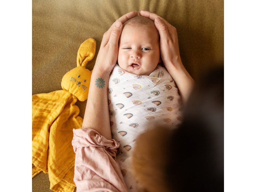 Kromě plenek Moussy zahrnuje řada bambusových mušelínů také bambusové zavinovačky Misty a roztomilého zajíčka do postýlky Huga.