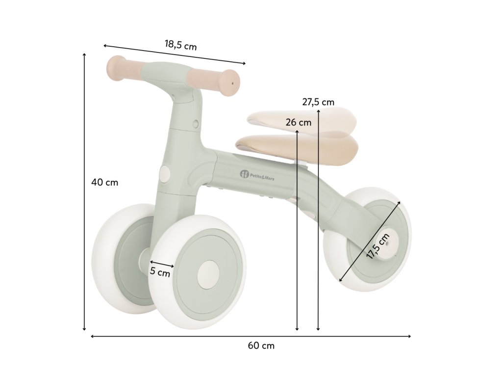 Bingo má otočná řídítka, dvě nastavitelné výšky sedla a váží jen 2,3 kg, takže ho rodiče bez problémů přenesou – i s taškou nebo dítětem v druhé ruce. Pěnová kolečka jsou tichá a zvládnou interiér i venkovní povrch. Celý design působí moderně, jemně a zároveň nadčasově.