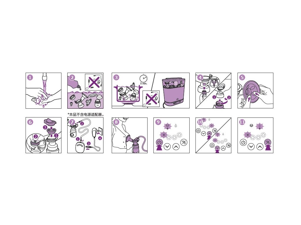 - Součásti odsávačky mateřského mléka nebo kabel USB nikdy nedávejte do vody ani do sterilizátoru, jinak je můžete trvale poškodit.