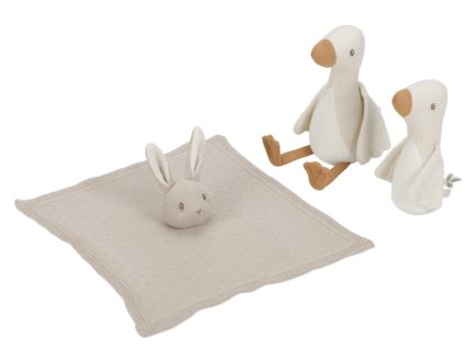 Krásná dárková sada hraček z jemné pleteniny je ideální jako dárek pro novorozené miminko. Sada obsahuje muchláčka s králíčkem a dvě hračky v podobě husy.