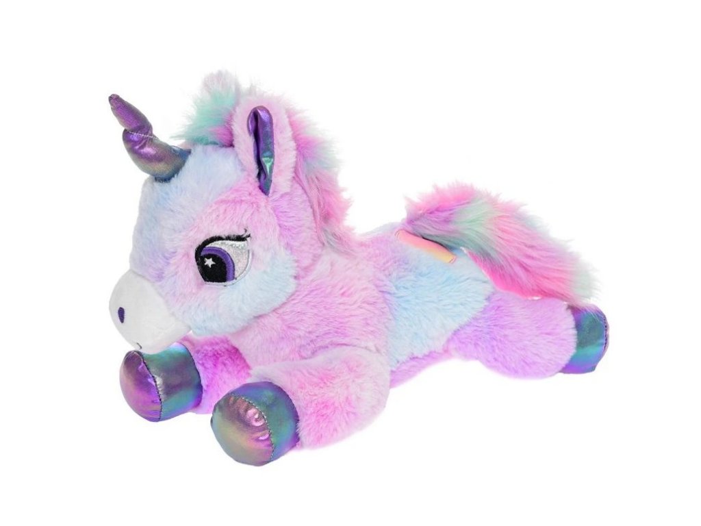 Nádherný ležící plyšový jednorožec s duhovou hřívou pro malé slečny. Vybírat můžete ze dvou barevných variant.