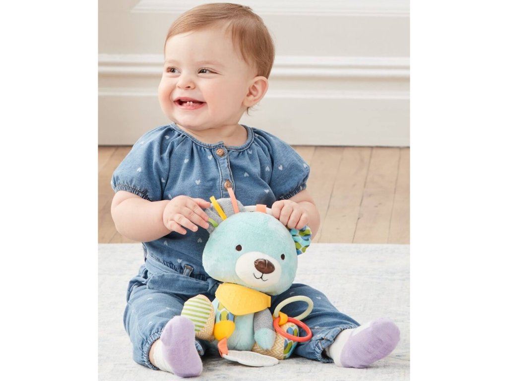 Malé ručky Vašeho dítěte budou díky hračce na kočárek Skip Hop neustále zabaveny. Budou zkoumat různé materiály, textury a zvuky, čímž je podpořen rozvoj jemné motoriky a smyslů dítěte. Tato krásně barevná hračka, která chrastí a zvoní, je ideálním společníkem jak na doma, tak na cesty. Vybrat si můžete jedno ze čtyř veselých zvířátek. Díky poutku ho můžete kamkoliv pověsit.