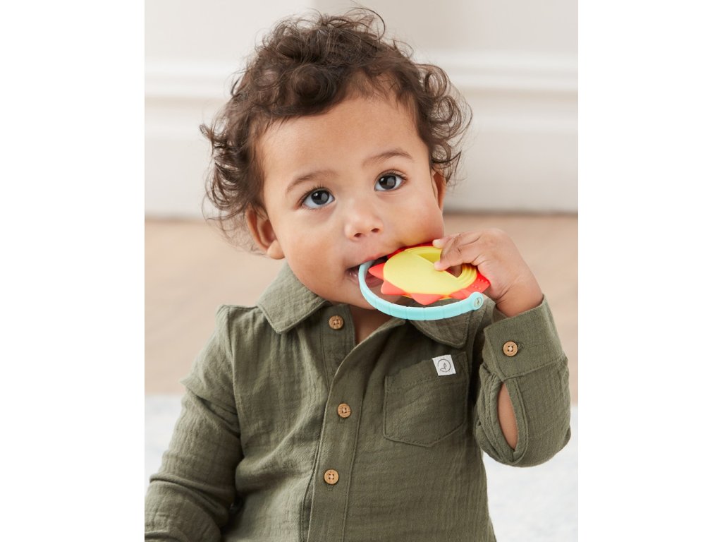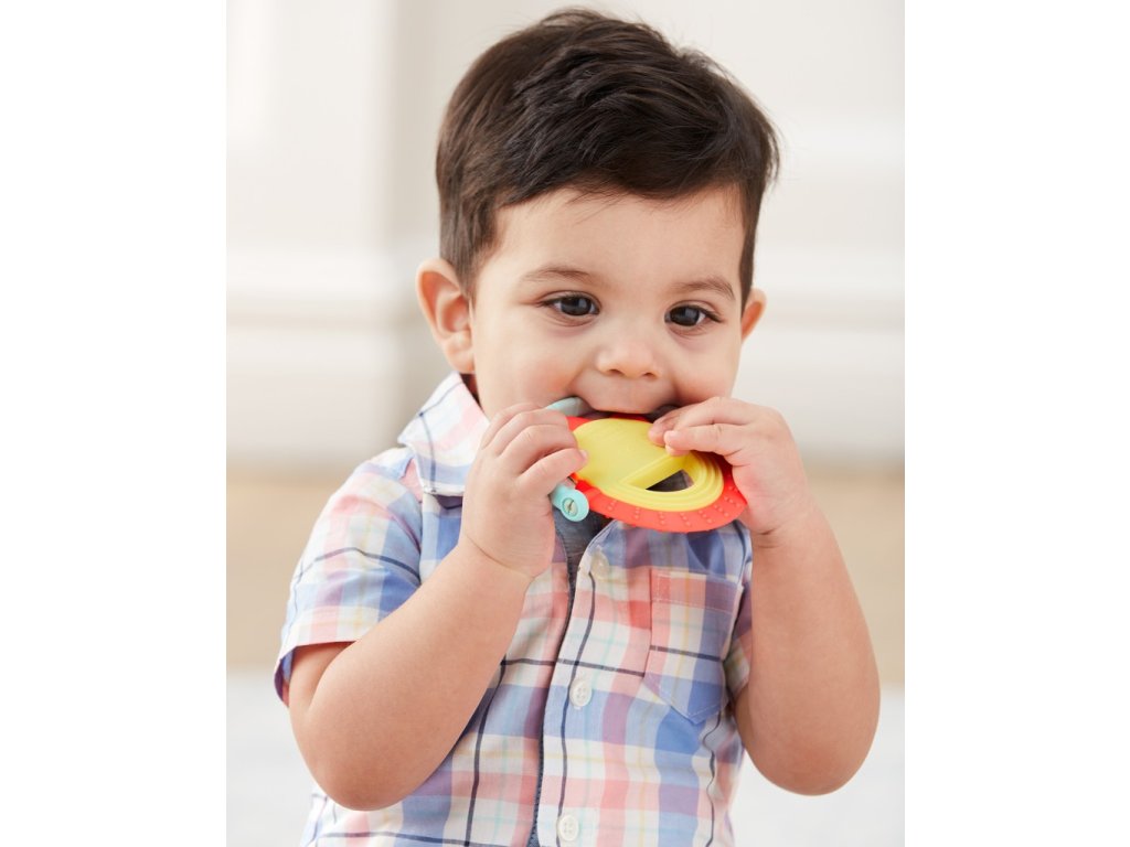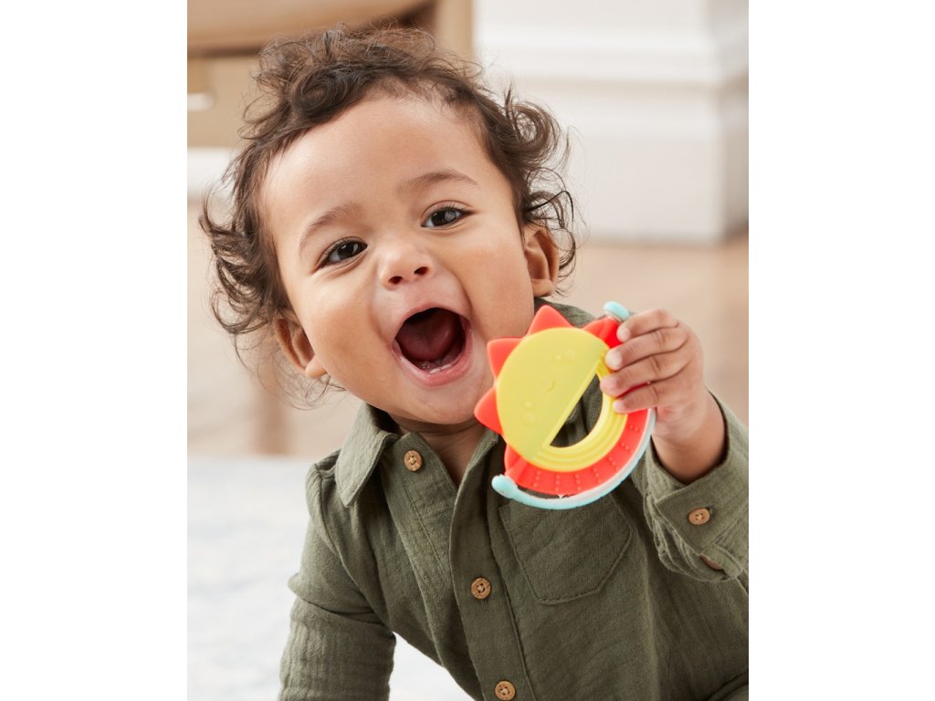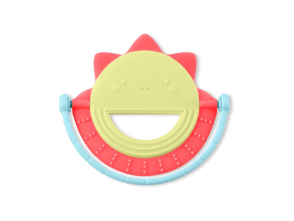 Ahoj, sluníčko! Rozkošná kousátka, která pomůže při prořezávání prvních zoubků. Měkký silikonový materiál s texturami, které jsou vhodné pro kousání, zároveň děťátko také zabaví. Lehce uchopitelný tvar obsahuje také pohyblivý kroužek, který mohou malé ručičky objevovat.