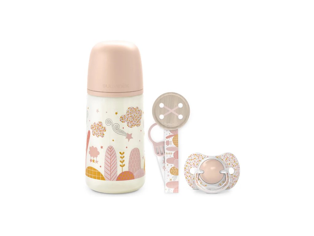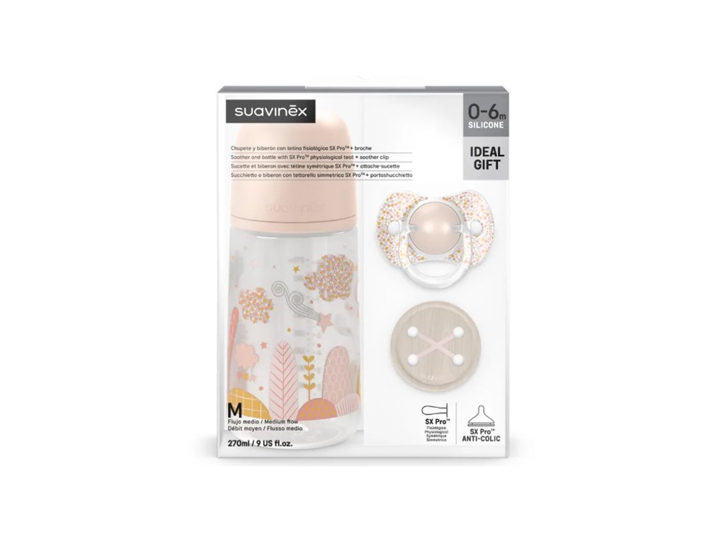 Suavinex sada Láhev 270ml + dudlík fyziologický 0-6m + klip Dreams -růžová