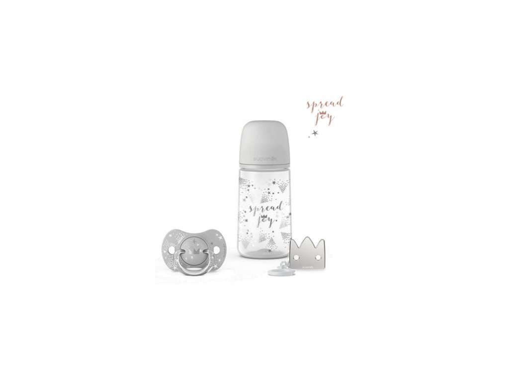 Suavinex sada Láhev 270ml + dudlík fyziologický 0-6m + klip Joy - stříbrná