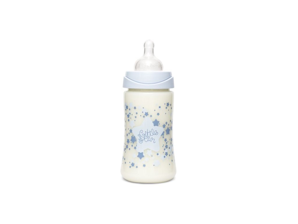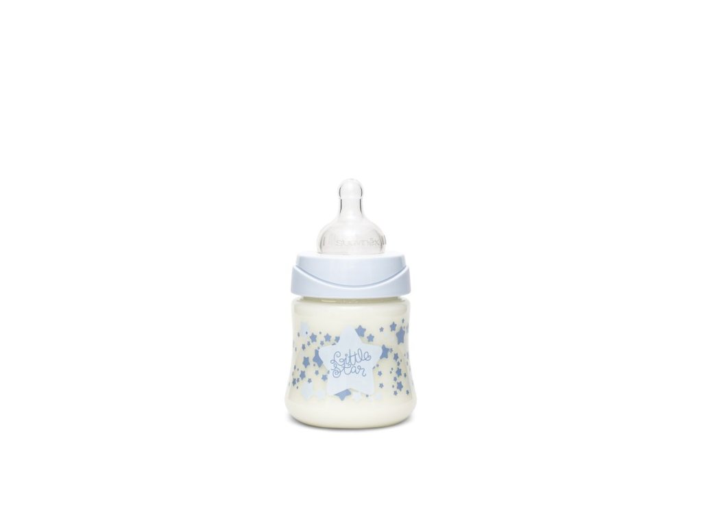 Širokohrdlá láhev umožňuje rodičům snazší mytí a přípravu pokrmu a díky svému širokému dnu je lépe stabilní. Její ergonomický tvar podporuje lepší uchopení během krmení miminka. Má kulatou silikonovou savičku a anti-kolikové průduchy, které zamezují hromadění vzduchu a jeho polykání během krmení, čímž se snižuje pravděpodobnost vzniku novorozenecké koliky. 3-poziční savičkou lze koordinovat sílu průtoku pokrmu pouhým pootáčením.