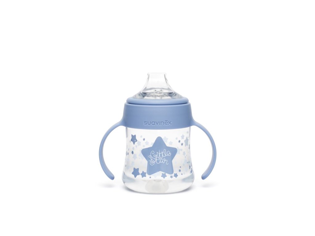 První láhev s oušky s nerozlitnou savičkou usnadňuje přechod z kojenecké láhve na pití z hrníčku či sklenice. Silikonové pítko je měkké a materiálově shodné se savičkami kojeneckých lahví, proto ho Vaše děti přijmou rychleji než běžná tvrdá pítka. První láhev má ergonomický tvar a držadla vhodná pro drobné dětské ruce, které umožní její snadné uchopení. Netekoucí savička zabraňuje vytékání tekutiny z lahvičky.