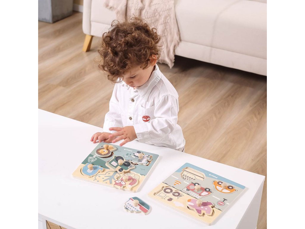 Prvky skládačky jsou opatřeny dřevěnými kolíčky, díky nimž může batole snadno uchopit skládačku do ruky a umístit ji na správné místo na dřevěném podkladu. Jedná se o jeden z nejlepších způsobů, jak si procvičit soustředění a koordinaci ruka-oko.