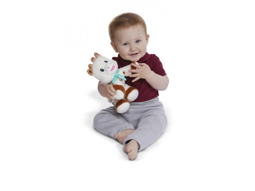 Extra měkký plyšák vyrobený z mikro sametového materiálu láká k přitulení a díky malým korálkům umístěným v těle hračky a v koncových částech nožiček umí žirafka sama sedět nebo stát na všech čtyřech.