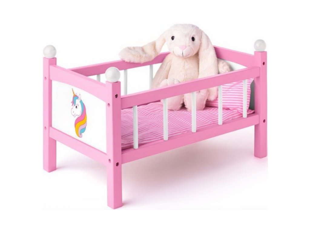Stylová dřevěná postýlka s motivem jednorožce a polštářem, přikrývkou. Určeno pro panenky dlouhé max. 44cm. Vzor povlečení se může lišit od vyobrazení. Dodáváno v rozloženém stavu. Plyšák není součástí balení.