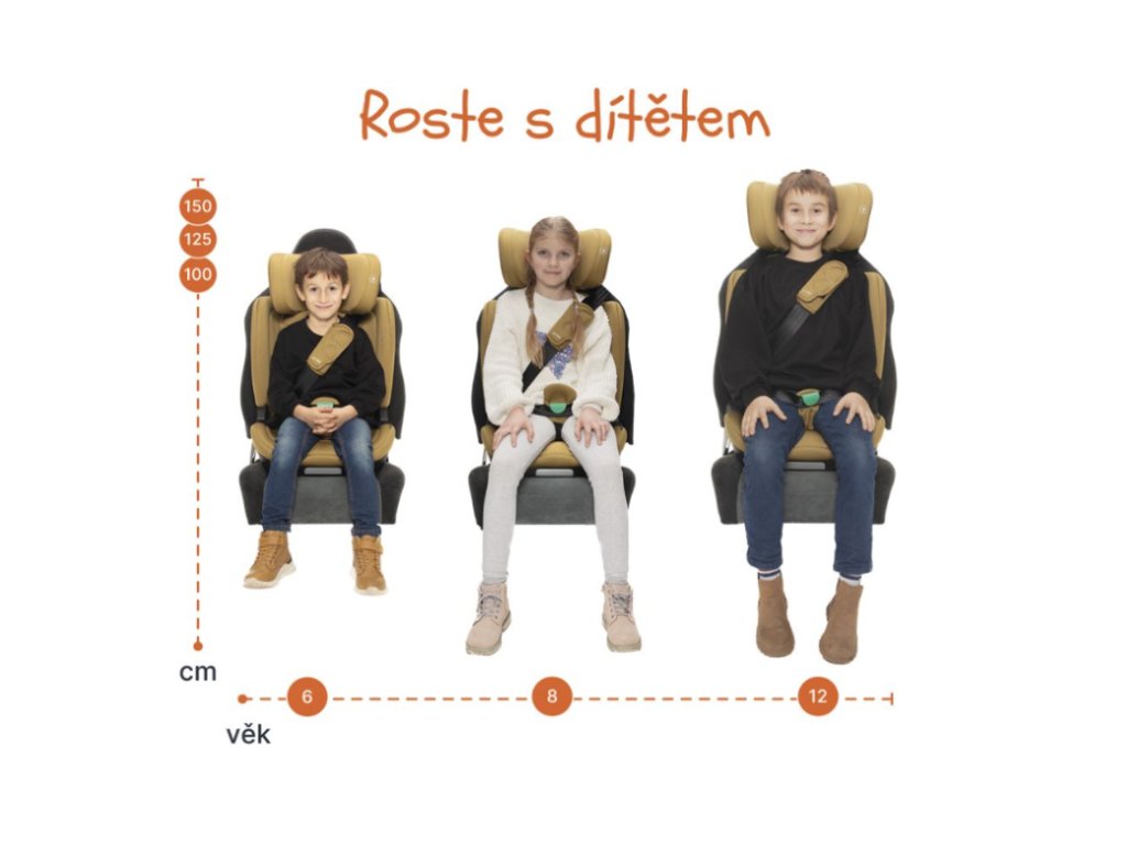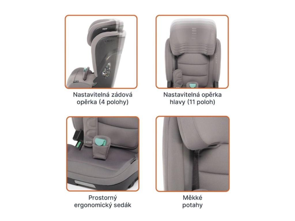 Prostorná autosedačka s měkkými potahy a možností naklonění do 4 ergonomických poloh zajistí pohodlnou cestu i při delší jízdě a během spánku. Polohování se dá jednoduše nastavit pojistkou ve přední části autosedačky. Opěrka hlavy nabízí až 10 poloh nastavení, díky tomu autosedačka roste s dítětem.