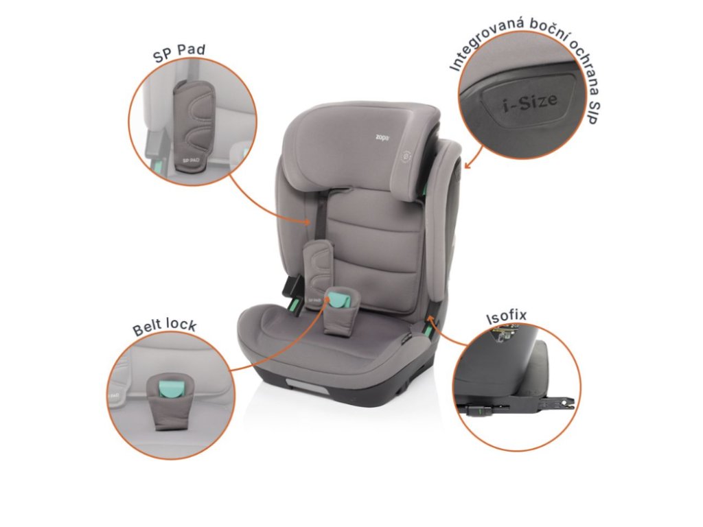 Polohování do 4 pozic, výškově nastavitelná opěrka hlavy, SIP ochrana bočního nárazu, bezpečnostní vycpávky SP PAD, Belt Lock, nezávislé ISOFIX, instalace pomocí ISOFIX i bezpečnostním pásem vozidla, splňuje normu i-SIZE – to je autosedačka Matrix i-Size.