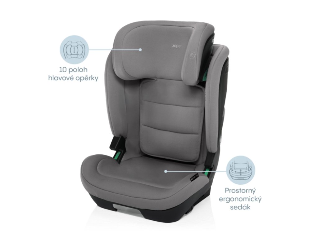 Prostorná autosedačka s měkkými potahy a možností naklonění do 4 ergonomických poloh zajistí pohodlnou cestu i při delší jízdě a během spánku. Polohování se dá jednoduše nastavit pojistkou ve přední části autosedačky. Opěrka hlavy nabízí až 10 poloh nastavení, díky tomu autosedačka roste s dítětem.