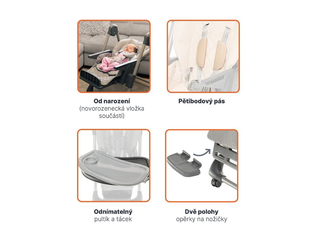 Polohovatelná zádová opěrka, polohovatelná opěrka na nožičky, nastavení výšky židličky, nastavení vzdálenosti pultíku, 5bodový bezpečnostní pás, snadné čištění, vložka pro menší děti, kolečka s brzdou, kompaktní rozměry ve složeném stavu – to je jídelní židlička Monti 2. Vhodné pro děti od narození do 15 kg.