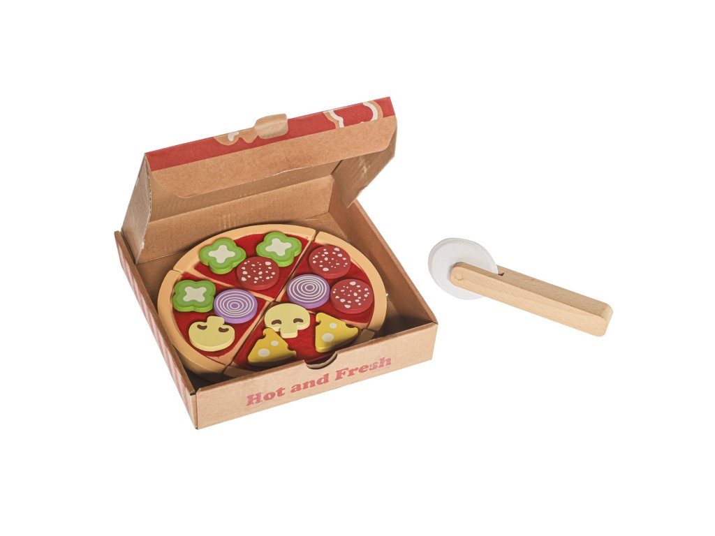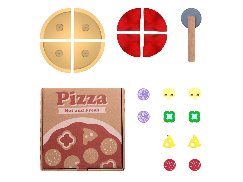 Krabice na pizzu, kráječ na pizzu, dřevěné těsto, přísady na pizzu, suchý zip na jednotlivých dílcích, rozvoj kreativity a koordinace ruka-oko, rozvoj jemné motoriky – to je Dřevěná pizza v krabičce.