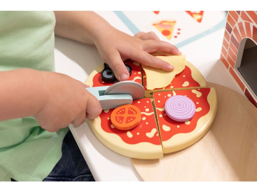 Díky realistickému designu a jasným barvám hračka přitahuje pozornost dětí a motivuje je k hravému učení. Děti si mohou hrát na šéfkuchaře, rozvíjet svou zručnost a koordinaci pohybů. Sada obsahuje suché zipy, které umožňují dětem snadno oddělit a spojit díly pizzy, což rozvíjí jejich logické uvažování. Kreativní zábava je doplněna kartonovou krabicí, kterou si děti mohou složit a představit si, že rozvážejí lahodnou pizzu svým "zákazníkům".