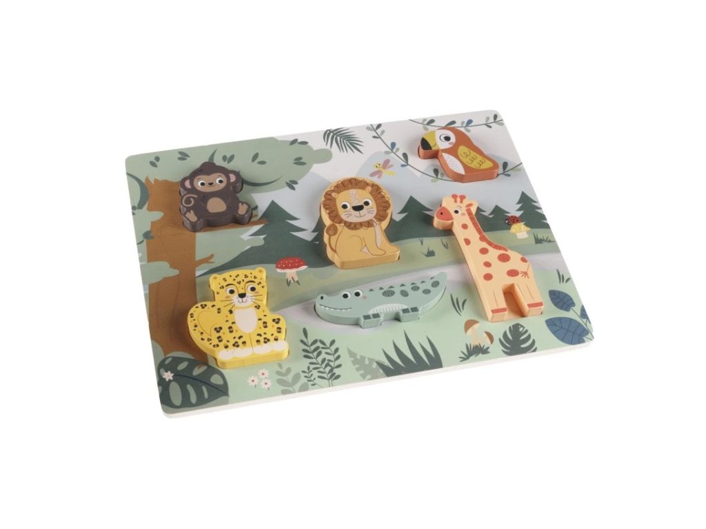 Zábavné puzzle s motivem džungle, rozvoj koordinace ruka-oko, odolné dřevo bez třísek, bezpečné netoxické barvy – to je Dřevěné puzzle Jungle.