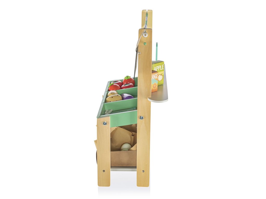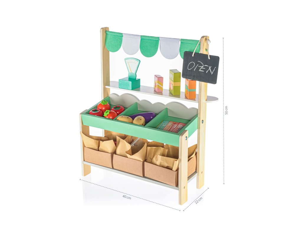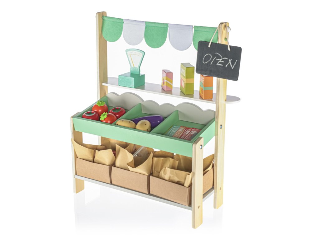 Stánek je vybaven tabulkou, na kterou si děti mohou křídou napsat ceny a denní nabídku, či si sami určit, zda je stánek otevřený nebo zavřený. Fantazii se meze nekladou, a děti zažijí při obchodování spoustu dobrodružství. Součástí stánku jsou tři dřevěné bedýnky, které vypadají jako ty skutečné ze zelinářství, a několik kousků ovoce a zeleniny ze dřeva.