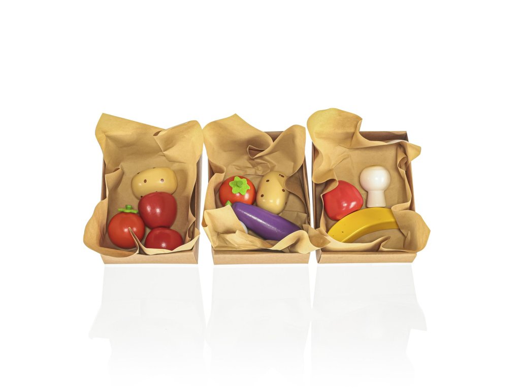 K tomuto obchodnímu setu patří také kartonové bedýnky s papírem pro pohodlný nákup, váha, nákupní seznam, peníze. Set obsahuje také rajčata, brambory, lilek, banán a další ovoce a zeleninu, takže není potřeba nic dalšího dokupovat. Vaše děti si mohou okamžitě začít hrát a zažívat radost z obchodování.