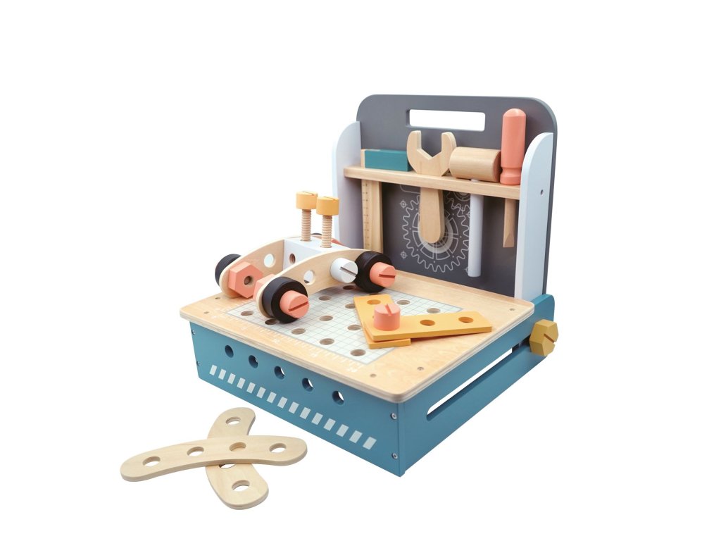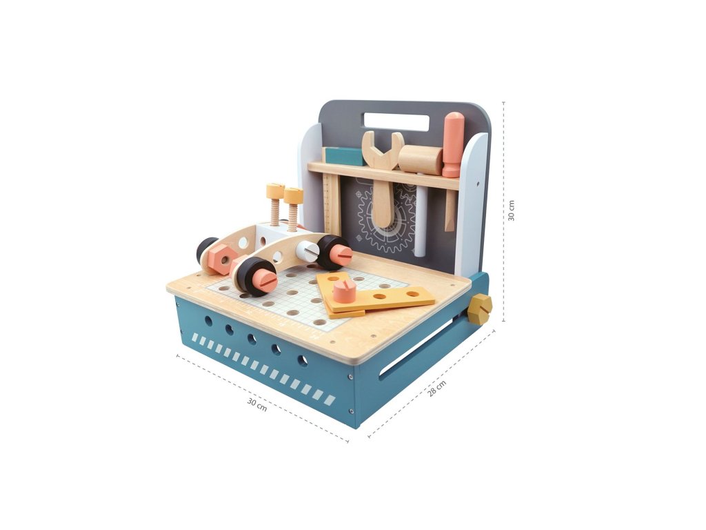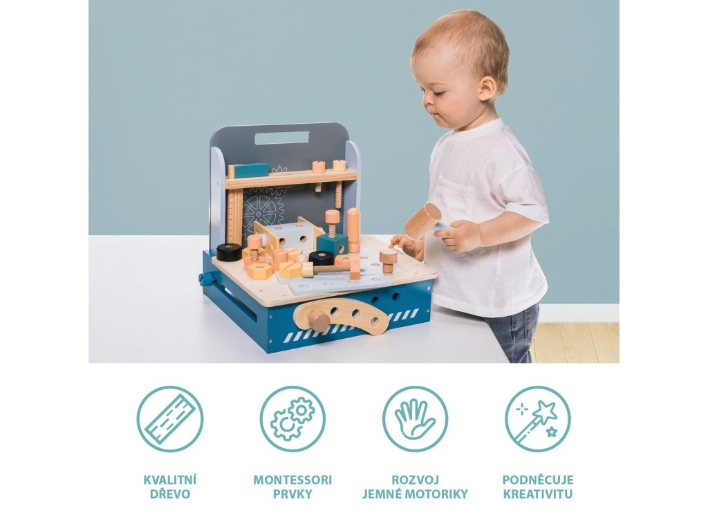 Kompaktní skládací ponk má velké množství dřevěných komponentů od dřevěných destiček s dírkami, po šroubky a matky. Díky nepřebernému množství skládacích možností podněcuje dětskou mysl a podporuje kreativní myšlení. Také rozvíjí jemnou motoriku a základní koordinaci rukou. Skládací ponk je vyrobený z kvalitního dřeva a barev na vodní bázi.