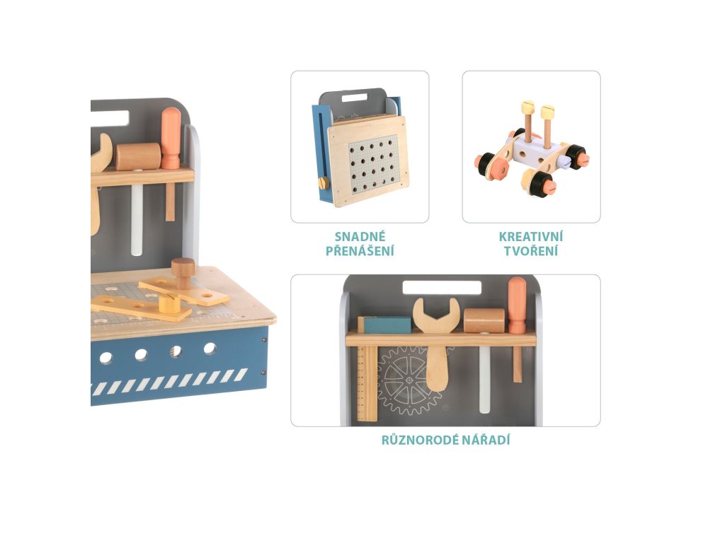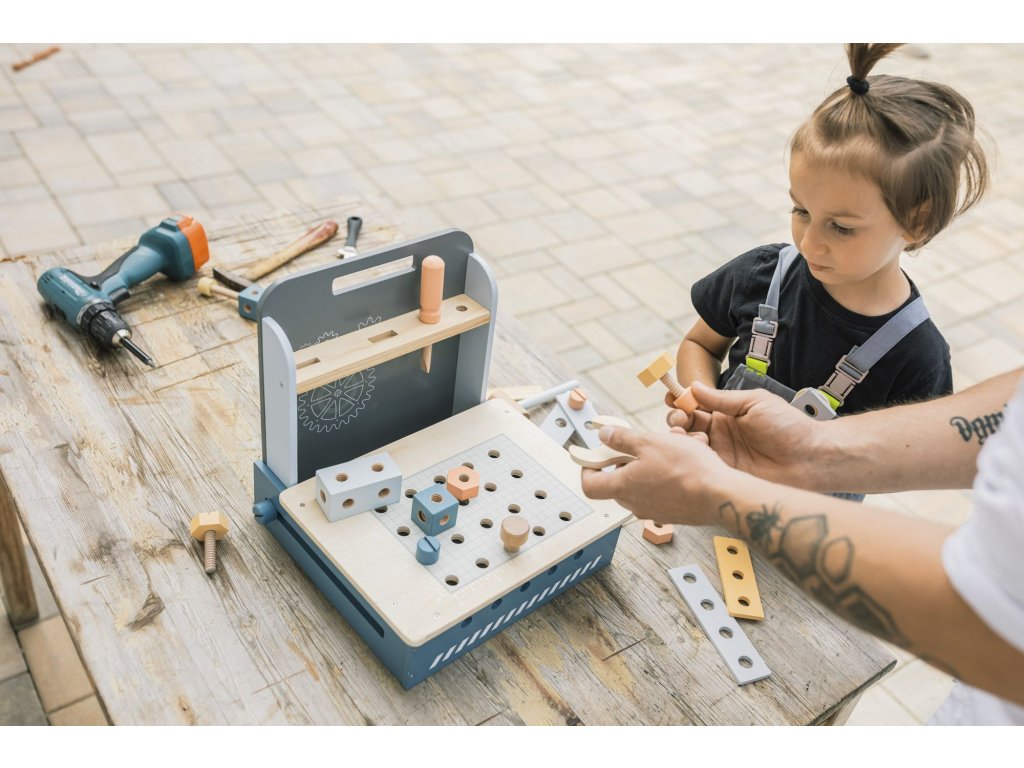 Kompaktní skládací ponk má velké množství dřevěných komponentů od dřevěných destiček s dírkami, po šroubky a matky. Díky nepřebernému množství skládacích možností podněcuje dětskou mysl a podporuje kreativní myšlení.
