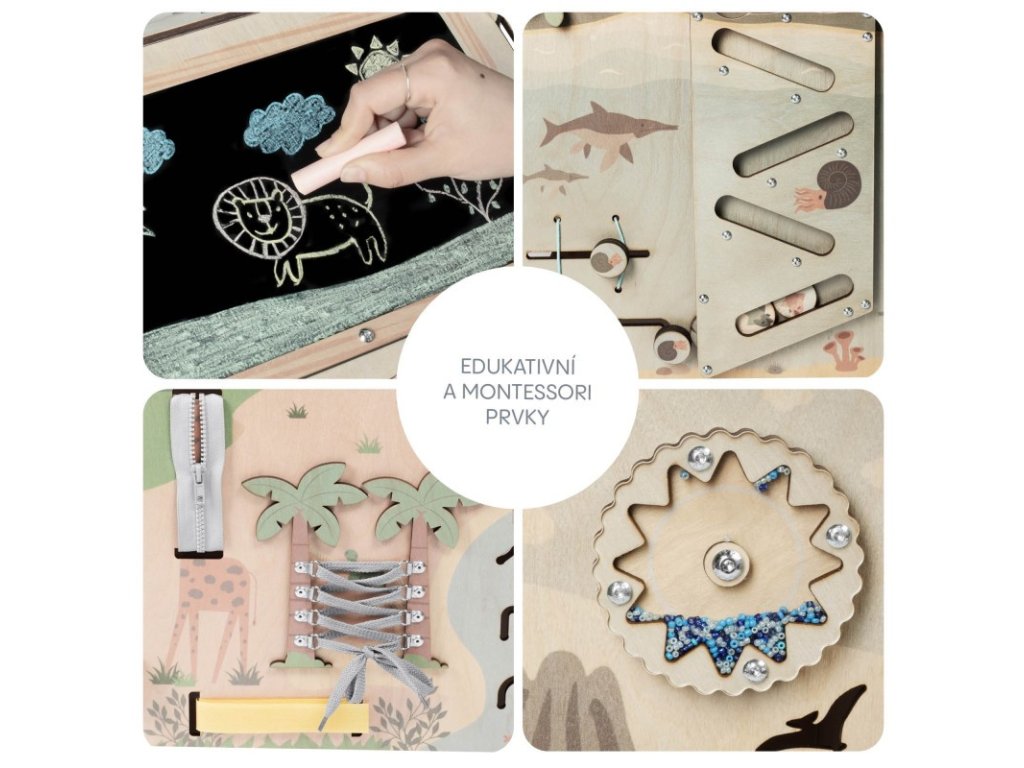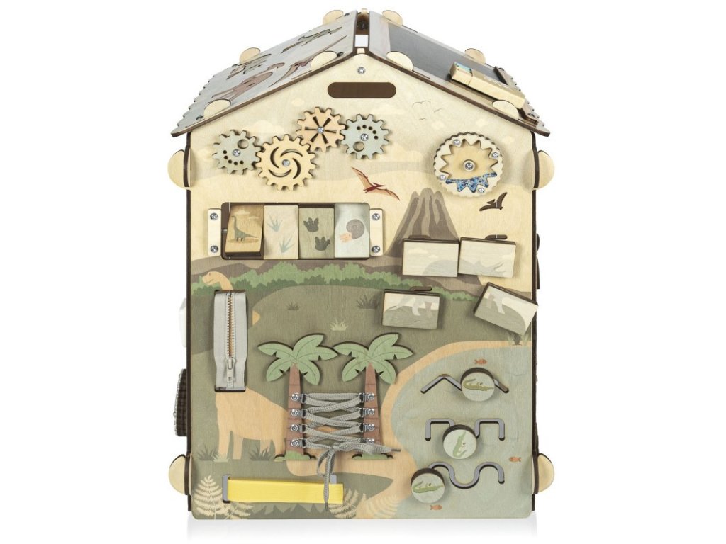 Na domečku najdete tkaničku, šněrování, zipy, ozubená kolečka, labyrinty, a dokonce i mechanický vypínač. Všechny tyto prvky pomáhají dětem stát se šikovnějšími a samostatnějšími. A přitom je to jen hra.