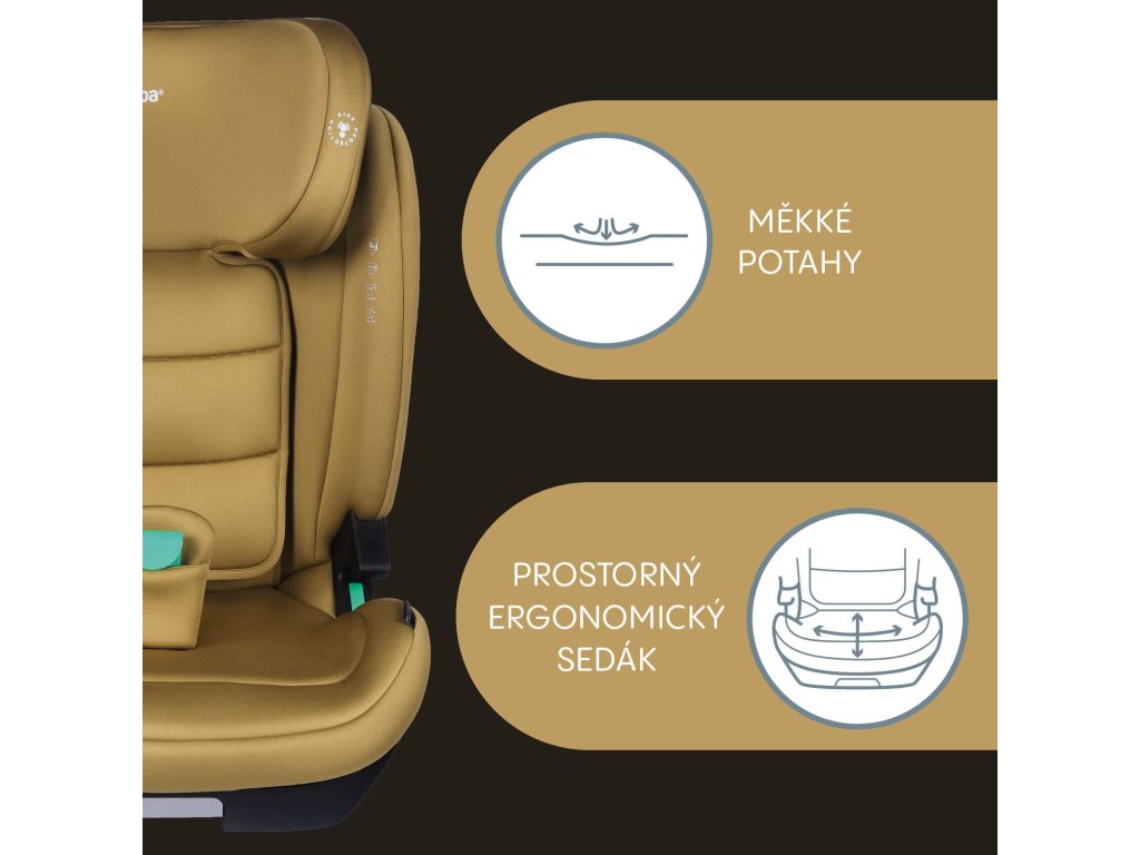 Polohování do 4 pozic, výškově nastavitelná opěrka hlavy, SIP ochrana bočního nárazu, bezpečnostní vycpávky SP PAD, Belt Lock, nezávislé ISOFIX, instalace pomocí ISOFIX i bezpečnostním pásem vozidla