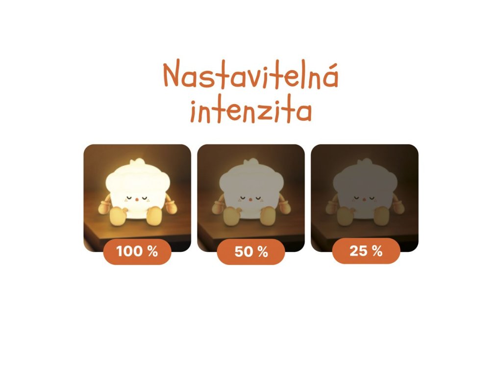 Zpříjemněte usínání vašeho děťátka s naší noční lampičkou ve tvaru roztomilého zvířátka. Skvěle se hodí jako doplněk do dětského pokoje nebo jako přenosné světýlko na cesty. Je ideální i pro umístění přímo do postýlky, kde svým tlumeným světlem vytváří příjemnou atmosféru pro ničím nerušený spánek. Lampička je vyrobena z mimořádně jemného silikonu, který je příjemný na dotek, odolný a bezpečný i pro nejmenší děti. Silikonovou část lze navíc snadno umýt i v myčce nádobí, což zajišťuje vždy hygienické použití.