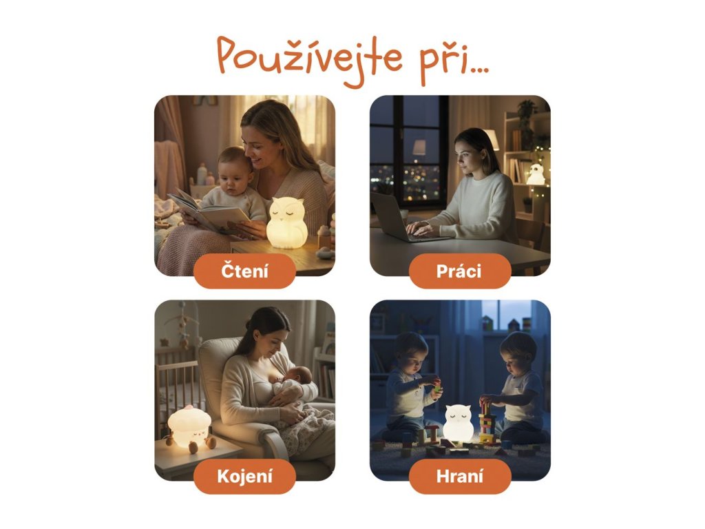 Zpříjemněte usínání vašeho děťátka s naší noční lampičkou ve tvaru roztomilého zvířátka. Skvěle se hodí jako doplněk do dětského pokoje nebo jako přenosné světýlko na cesty. Je ideální i pro umístění přímo do postýlky, kde svým tlumeným světlem vytváří příjemnou atmosféru pro ničím nerušený spánek.