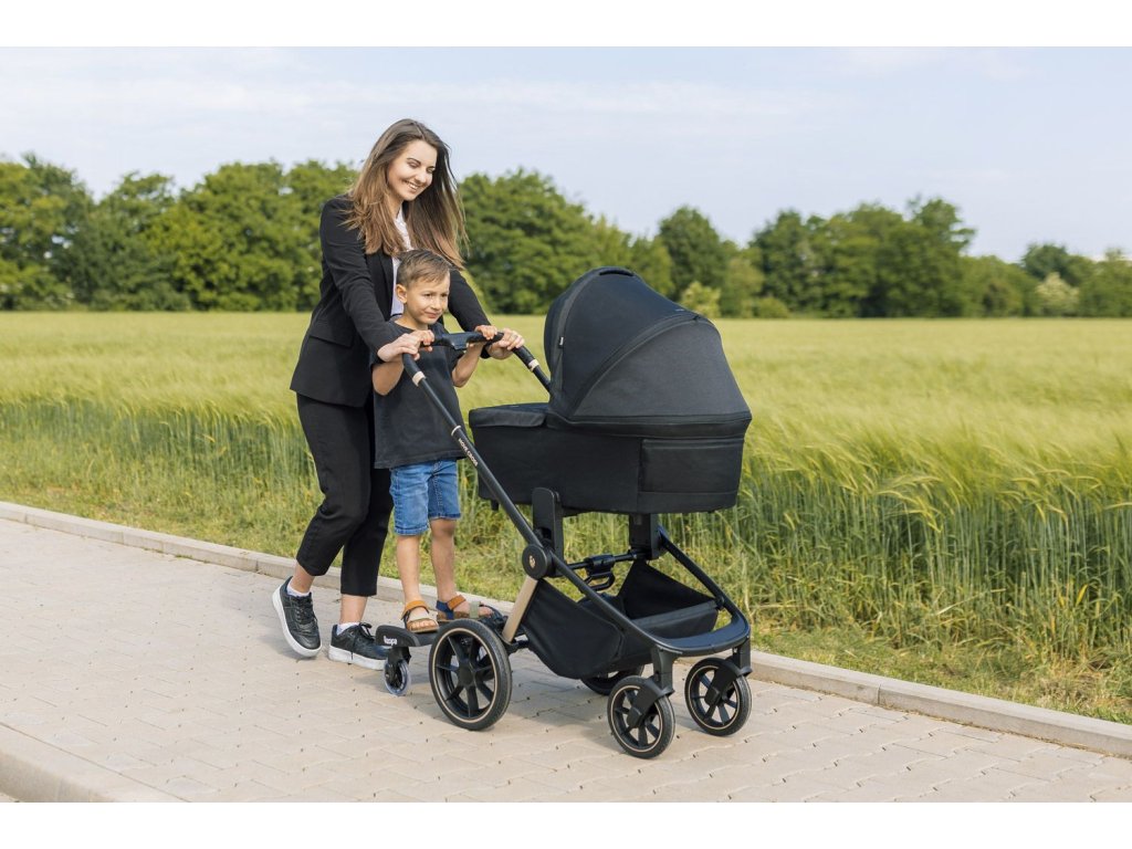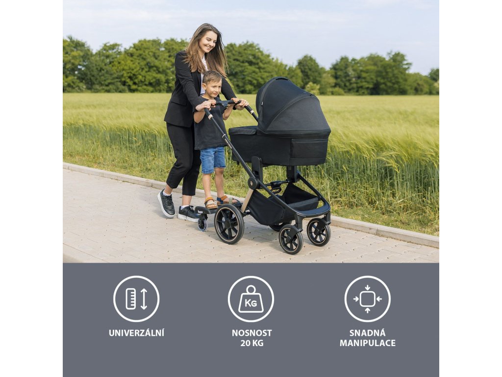 Zábava a pohodlí pro staršího sourozence, snadno připojitelný ke všem kočárkům, lehce ovladatelný a stabilní, nosnost 20 kg, odpružená kolečka s kuličkovými ložisky, nastavení úhlů a délky připevňovacích ramen, poutko pro zavěšení na kočárek – to je stupátko ke kočárku Segboard 2.