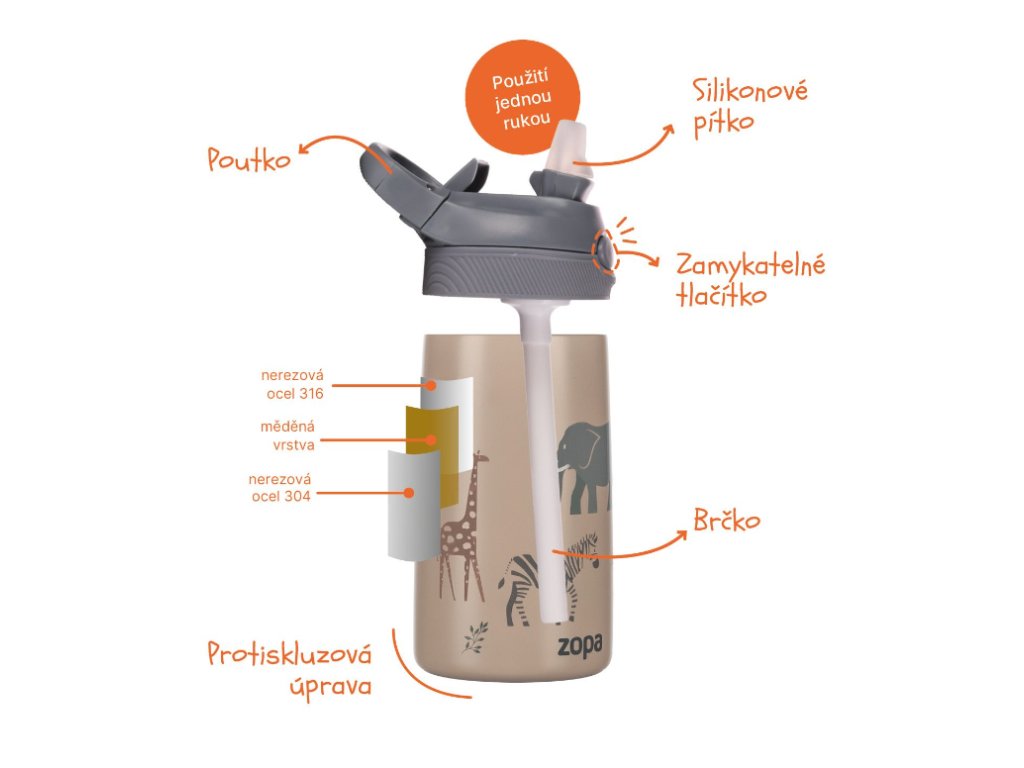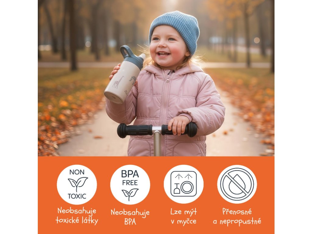 Dopřejte svému dítěti nápoj správné teploty po celý den! Naše sportovní termoska o objemu 400 ml je vybavena dvojitou stěnou a vakuovou izolací, která udrží nápoje teplé nebo studené.